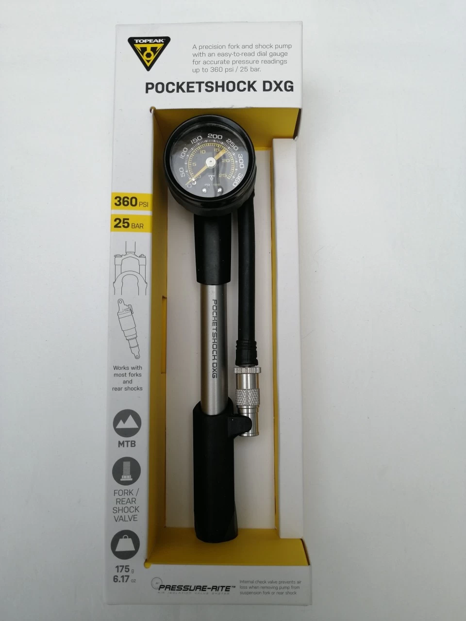 Die Pocket Shock DXG Dämpferpumpe von Topeak gibt mit bis zu 24,8 Bar (360 PSI) ordentlich Druck auf Dämpfer und Federgabel. Sie verfügt über einen um 360° drehbarem Ventilarm, Präzisionsmanometer und Luftablassventil. Während der flexible Schlauch das Ventil beim Pumpen schont, verhindert der spezielle Pressure-Rite™ Pumpenkopf mit Shock-Ventil effektiv Luftverlust beim Abnehmen der Pumpe. Durch ihr kompaktes Maß lässt sich die Topeak Pocket Shock DXG einfach in Trikot- oder Satteltaschen verstauen.